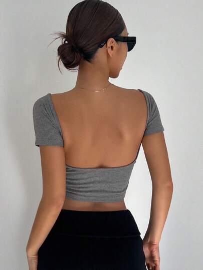 DAZY 纯色修身短袖 T 恤,背部镂空,外出上衣 - 淺灰色 - 查看 1