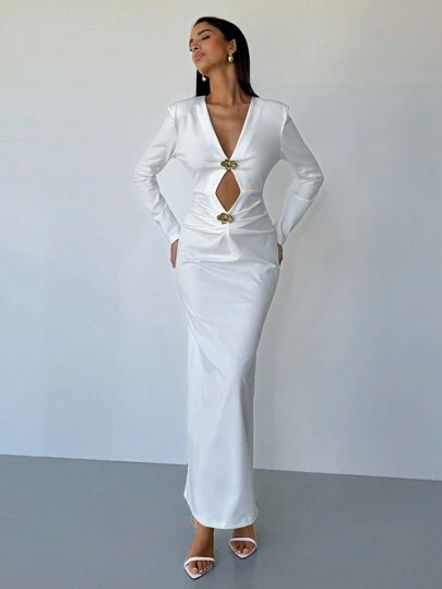 Aloruh 女士纯白色性感复古金属花朵装饰修身长袖连衣裙,优雅派对连衣裙,情人节装,情人节,女士连衣裙,优雅连衣裙,女士白色连衣裙,白色连衣裙,情人节连衣裙,女士礼服,女士优雅连衣裙 - 白色 - 查看 1