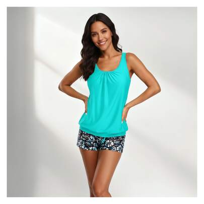 Turquoise Tankini Swimsuit For Women Floral Print Boy Shorts Two Piece Bathing Suit Tummy Control Ruched Swimwear UPF 50+ Adjustable Straps