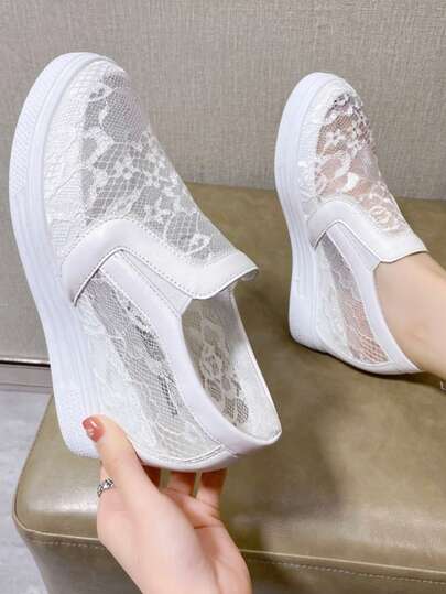 夏季蕾丝网眼一脚蹬厚底运动鞋,透气、百搭、舒适柔软的鞋底 - 白色 - 查看 1