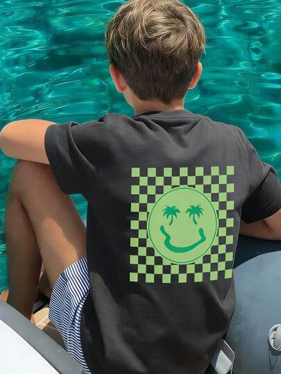 男童椰子树和人脸印花短袖T恤,青少年学生休闲夏季上衣