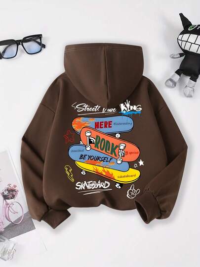 青少年男童休闲简约滑板图案运动风卫衣,长袖连帽卫衣,秋冬季学生男童服装 - 棕色 - 查看 1