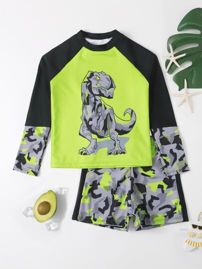 泳裝童裝,適合青春期男孩,恐龍印花,圓領設計,短袖套口 - 彩色 - 查看 1