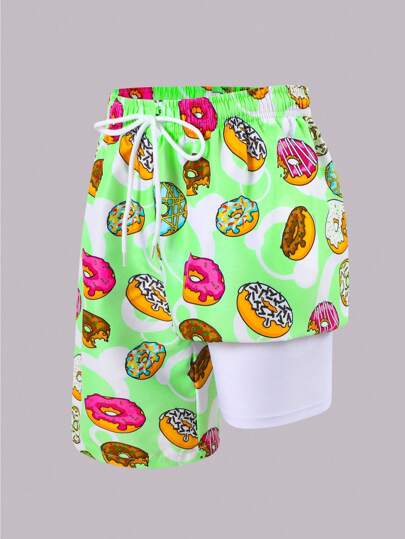 Tween Boy 甜甜圈印花抽绳腰部宽松游泳短裤 - 綠色 - 查看 1