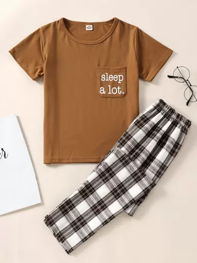 Tween Boy 字母图案贴袋 T 恤和格纹裤睡衣套装 - 彩色 - 查看 1