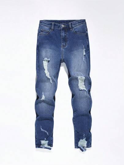 男大童破洞抽鬚漂白水洗牛仔褲 - 藍色 - 查看 1