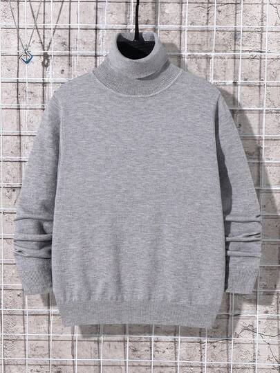 SHEIN 男童纯色高领长袖休闲毛衣,秋冬季 - 淺灰色 - 查看 1