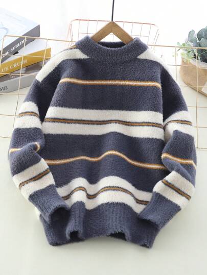 男大童條紋圖案落肩袖套頭毛衣 - 灰色 - 查看 6