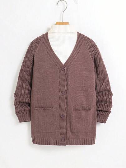 Tween Boy 纹理拼接口袋针织开衫,秋冬季保暖 - 卡其色 - 查看 1