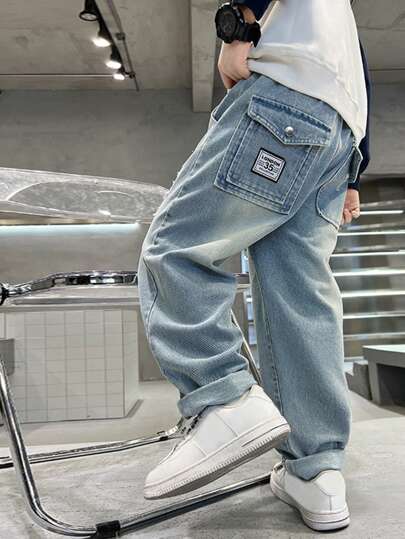 青少年男童复古直筒破洞牛仔裤,宽松版型,后袋翻盖纽扣闭合,适合8-14岁青少年及以上儿童日常穿着。 - 藍色 - 查看 4