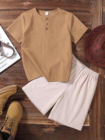SHEIN Tween 男童 2 件套,春夏 Wildeya 新款,休闲度假极简主义波西米亚风 T 恤 2 件套服装套装,适合户外活动、日常穿着和节日聚会 - 彩色 - 查看 6