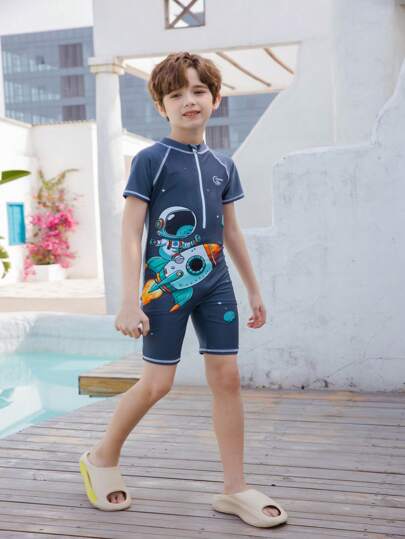 卡通宇航員騎火箭印花拉鍊短袖單件泳衣,適用於青少年男孩 - 灰色 - 查看 1