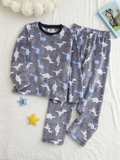 男童休闲恐龙印花保暖长袖上衣和裤子家居服套装