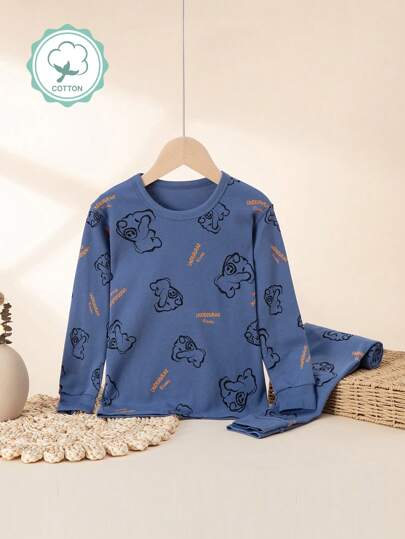 男童字母印花睡衣套装,适合大龄儿童春秋季的保暖睡衣 - 藍色 - 查看 1