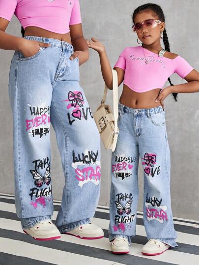 Tween Girl 休闲时尚印花洗水浅蓝色牛仔直筒牛仔裤 - 淺色水洗藍 - 查看 1