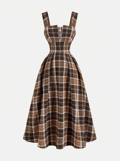 青少年女孩休闲简约舒适收腰开叉设计 A 字中长连衣裙 - 卡其色 - 查看 1