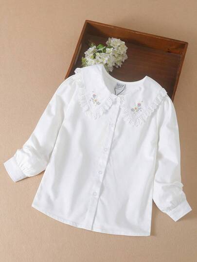 Tween Girl 學院風翻領長袖襯衫,春秋 - 白色 - 查看 1