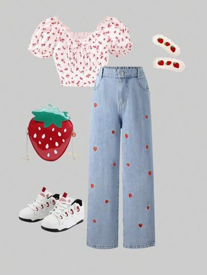 Tween Girl Denim 乡村度假甜美可爱草莓图案刺绣舒适百搭直筒牛仔裤 - 淺色水洗藍 - 查看 1