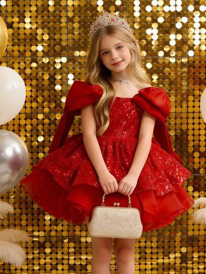 少女优雅可爱大蝴蝶结露肩亮片网眼派对连衣裙,适合生日、派对、圣诞节 - 紅色 - 查看 6
