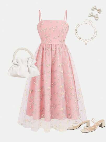 SHEIN Leap Crew Tween Girl 优雅花卉刺绣拼接网眼吊带中长连衣裙 - 淺粉色 - 查看 1