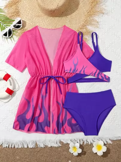 Tween Girl 火焰印花比基尼套装与和服夏日海滩 - 彩色 - 查看 1
