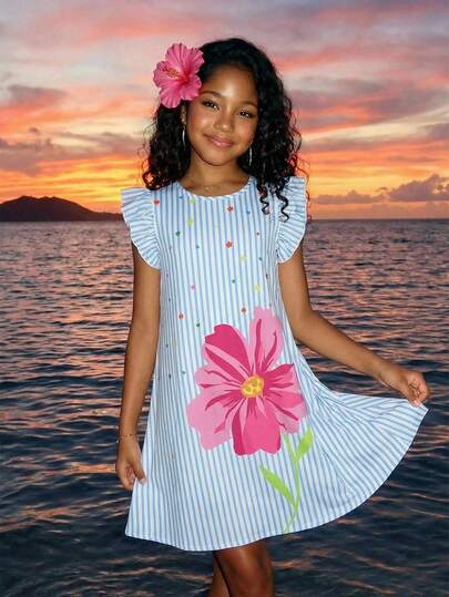 少女清新蓝白条纹印花荷叶袖圆领连衣裙 - 彩色 - 查看 1
