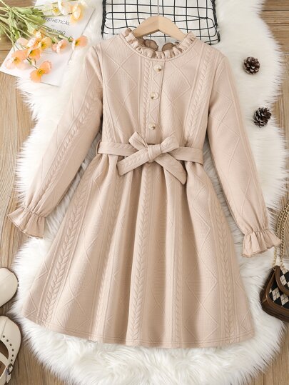 女孩褶邊荷葉袖繫腰帶連衣裙 - 卡其色 - 查看 1