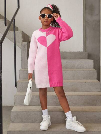 SHEIN 女大童愛心圖案雙色落肩袖毛衣洋裝 - 玫紅色 - 查看 1