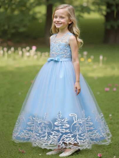 青少年女孩高端刺绣亮片无袖花童婚纱,蓬松生日婚礼派对公主礼服 - 藍色 - 查看 1