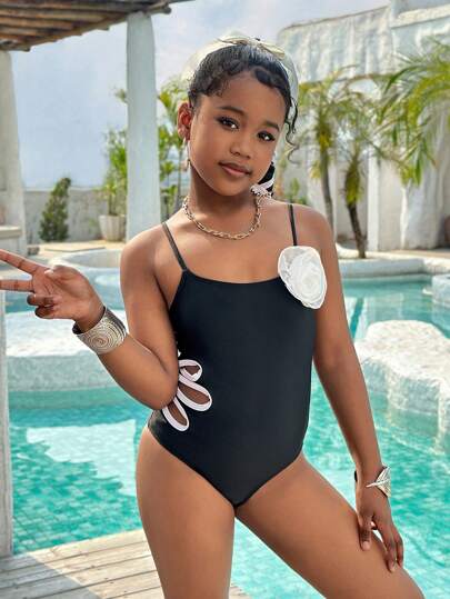 SHEIN Tween Girl 镂空撞色连体泳衣,腰部镂空花卉设计,适合海滩和夏季 - 黑色 - 查看 1