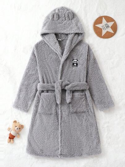 女大童貓熊刺繡3D耳朵設計連帽腰帶法蘭絨睡袍 - 灰色 - 查看 3