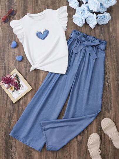 SHEIN Tween Girl 常规款盖袖心形图案 T 恤和阔腿裤套装 - 彩色 - 查看 1