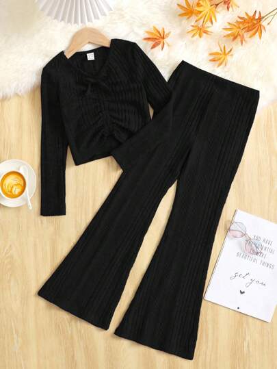 SHEIN 少女針織褶皺長袖T恤和喇叭褲休閒套裝,包括起皺前景T恤和喇叭褲 - 黑色 - 查看 1