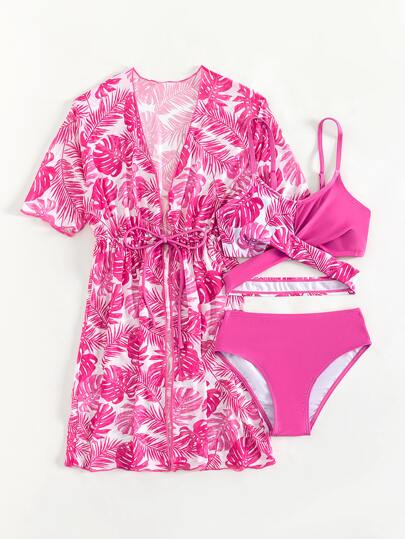 少女热带印花比基尼套装搭配和服夏日海滩 - 粉色 - 查看 1