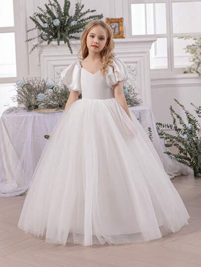 女童泡泡袖薄纱花童裙,公主裙,适合复活节、生日派对、婚礼、舞会、节日场合 - 白色 - 查看 1