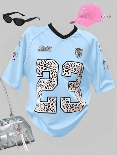 SHEIN Explorewe 青少年女孩蓝色运动休闲时尚街头字母印花图案 T 恤,时尚运动短袖 T 恤,夏季 - 彩色 - 查看 1