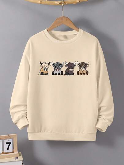 少女卡通印花圆领长袖运动衫 - 卡其色 - 查看 5