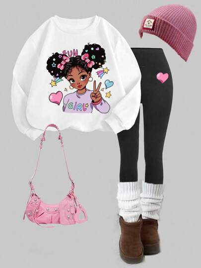 SHEIN Leap Crew 少女休闲可爱卡通印花白色长袖套头卫衣和黑色打底裤两件套,适合秋冬季穿着 - 彩色 - 查看 1
