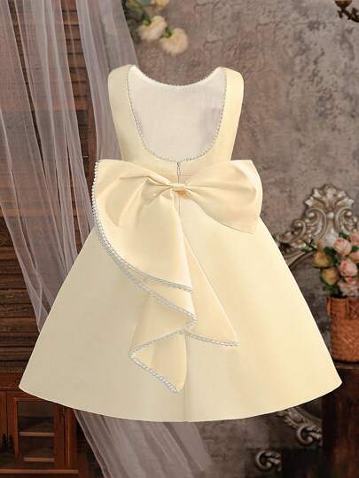 少女优雅露背大蝴蝶结婚礼派对花童礼服,时尚生日伴娘礼服,公主毕业典礼礼服,配仿珍珠 - 香檳色 - 查看 1