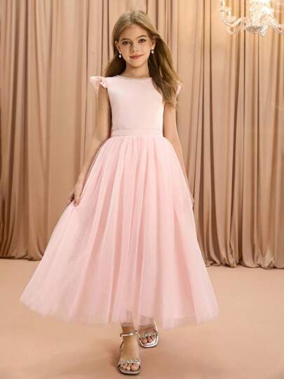 青少年女孩优雅奢华圆领蝴蝶结中长连衣裙,适合晚会、婚礼、节日、圣诞节、万圣节、生日、毕业典礼等场合 - 粉色 - 查看 2