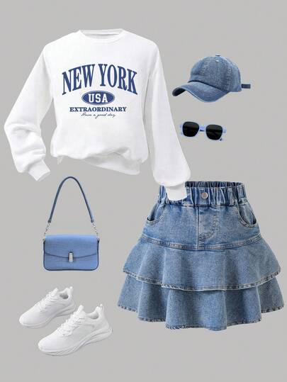 女童字母印花圆领长袖上衣和牛仔裙套装