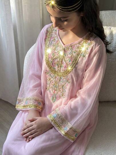 少女中东风亮片连衣裙搭配网纱套头外套套装,可爱粉色优雅派对装扮