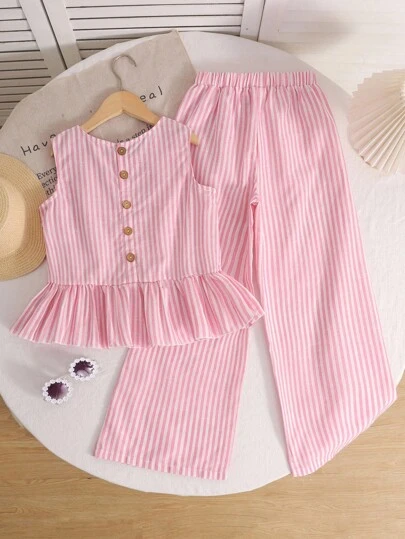 Tween 女童粉色条纹宽松休闲无袖圆领梭织衬衫搭配梭织宽松阔腿裤两件套 - 粉色 - 查看 1