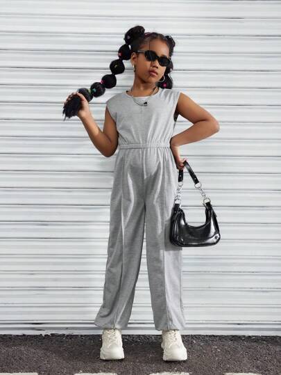 Tween 女童春夏休闲针织圆领无袖松紧腰连体裤、户外街头装哈伦裤