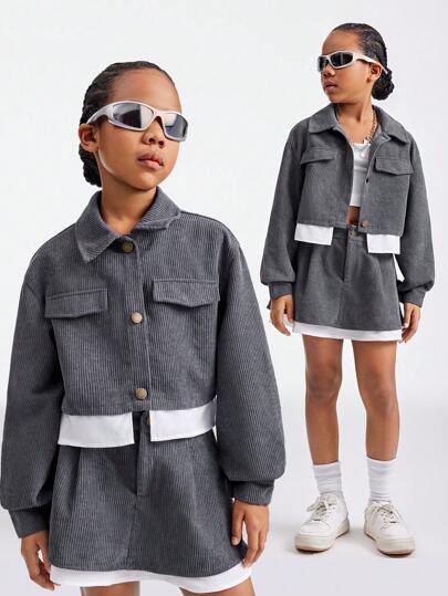 SHEIN Tween 女童春夏 2 件套灯芯绒拼布女童休闲长袖夹克和 A 字裙套装 - 灰色 - 查看 1