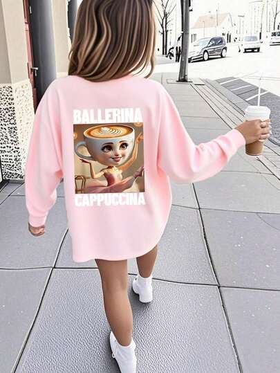 Tween Girls 的“Cappuccino Ballerina”图案印花长袖 T 恤,秋冬上衣 - 粉色 - 查看 1