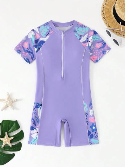 青少年女孩度假休闲印花拉链连体泳衣 - 紫色 - 查看 1