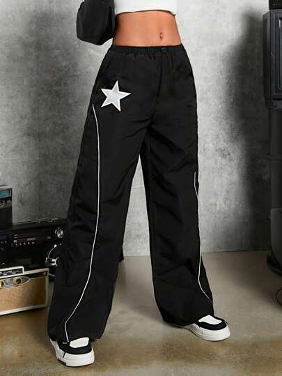 Tween 女童梭织拼接星星补丁抽绳阔腿休闲黑色长裤,带侧袋,返校季