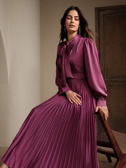 Anewsta 女士优雅蝴蝶结领褶皱连衣裙,适合除夕夜长款女装春季服装女士夏装 - 紫羅蘭色 - 查看 1