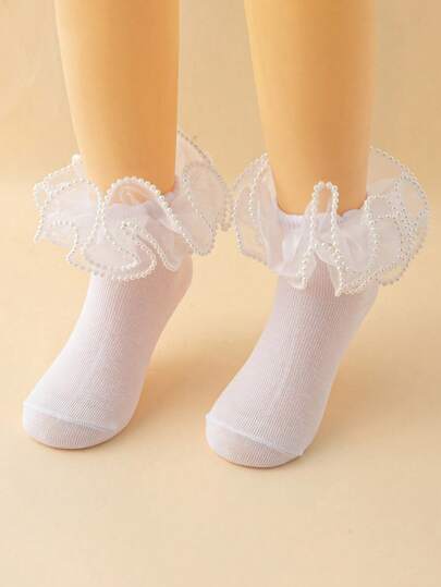 1 双女孩珍珠蕾丝舞蹈袜,优雅公主风格短袜,适合派对穿着 - 白色 - 查看 1